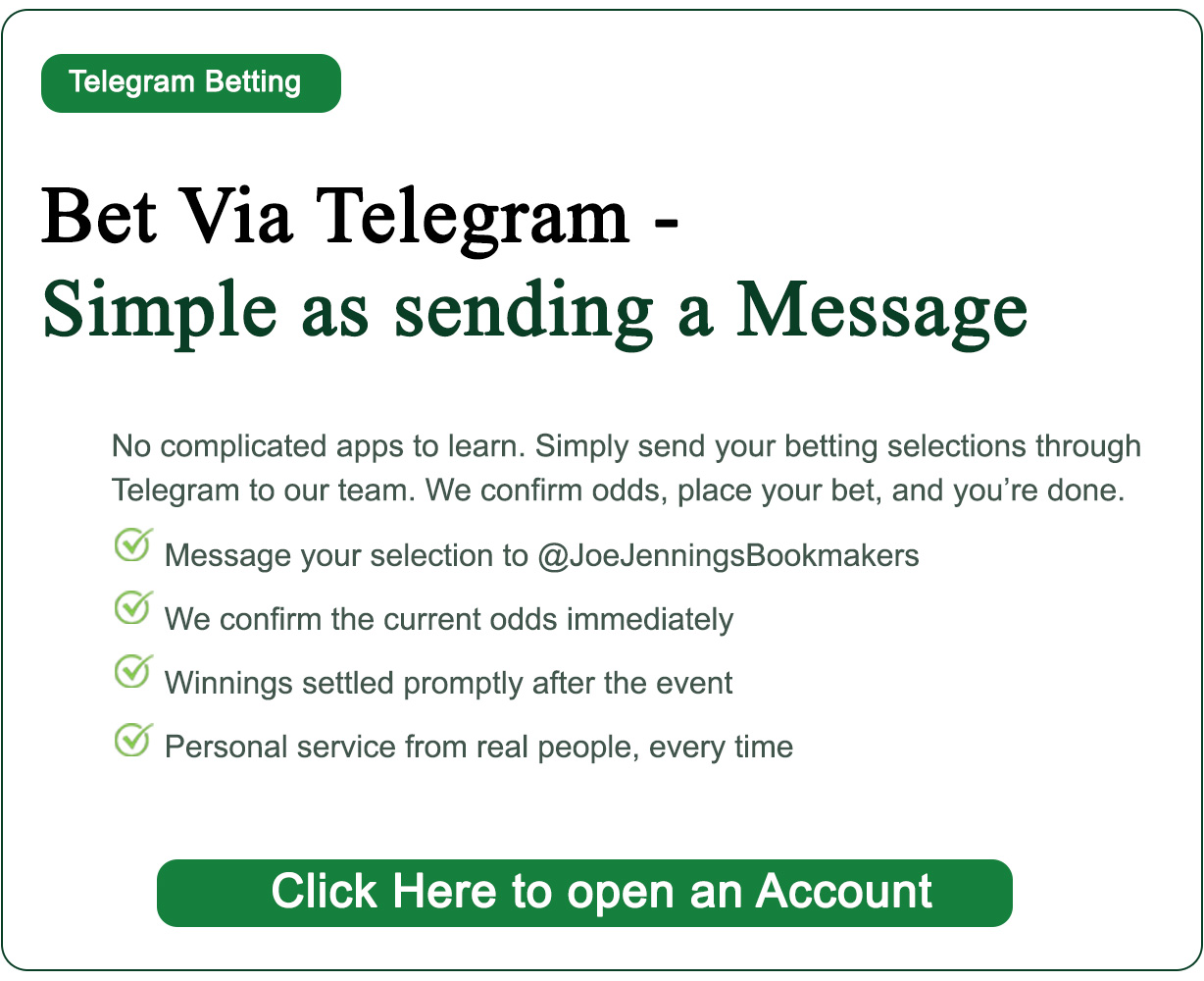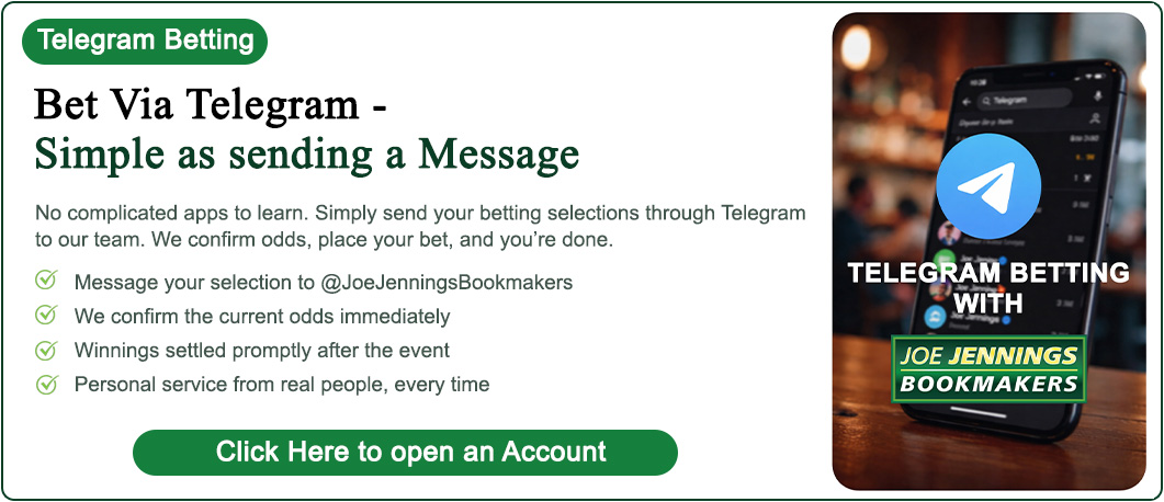 With our roots firmly in the sport of kings Joe Jennings Bookmakers are passionate horse racing fanatics and that’s why you’ll find best odds guaranteed available on all UK and Irish horse racing via our Telephone and Telegram Service. Further more, our shops also provide best odds guaranteed on selected races. You’ll never lose out if a horse goes off at a longer starting price than the price you’ve taken so a bet on the horses with Joe Jennings is a bet with confidence that you’ll always get the best possible payout.
