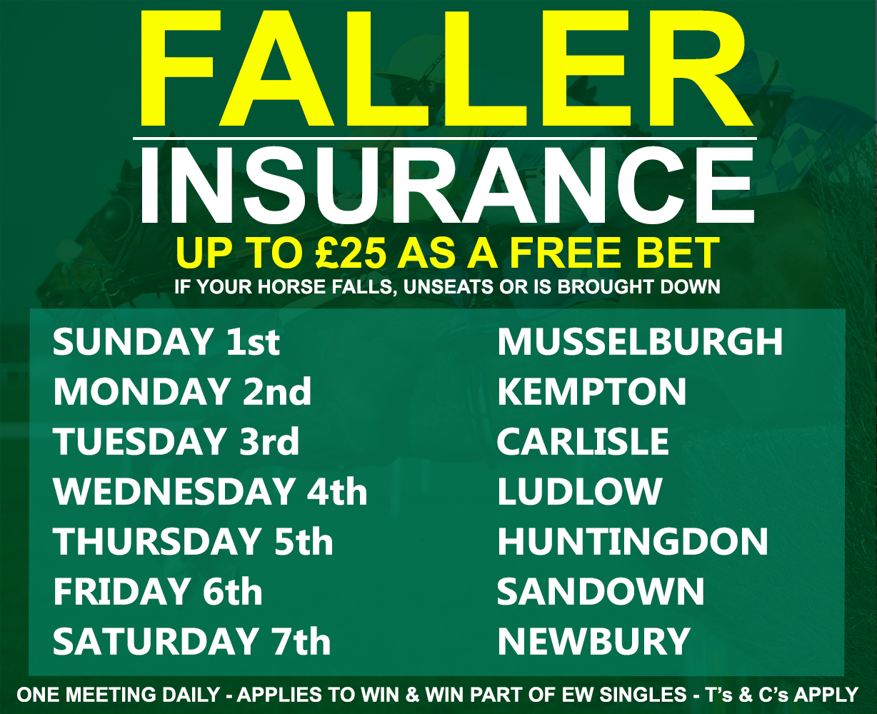 - Faller Insurance – Applies to real money singles win/ew from £5.00 or £5.00 ew from Saturday 11th October 2025. Faller Insurance will be applied to one meeting per day.